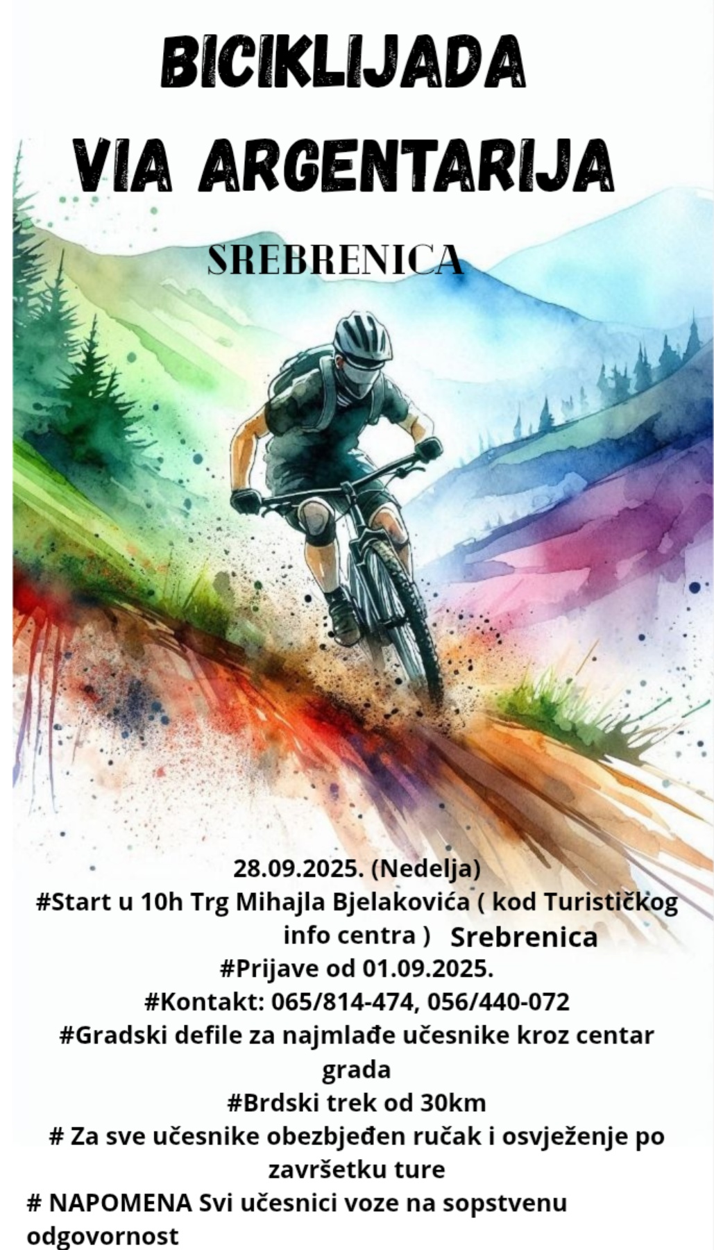 Turistička organizacija Srebrenica najavljuje prvu srebreničku Biciklijadu “VIA ARGENTARIA” zakazanu za 28. septembar 2025. godine. Biciklijada predstavlja uzbudljivu priliku za sve ljubitelje aktivnosti na otvorenom.